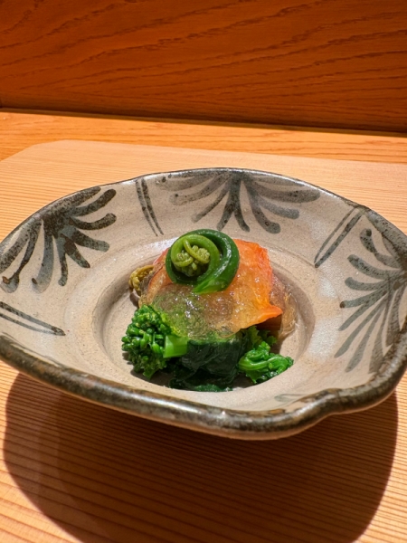 先付けは赤貝と山菜の出汁ジュレがけ